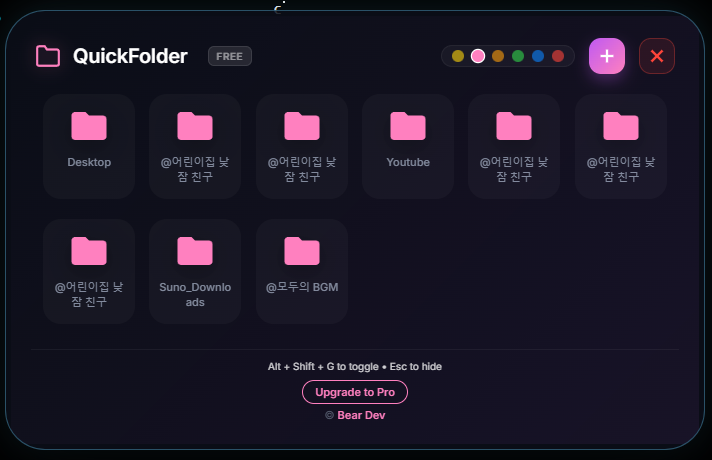 - 성장하는 프로 버전: 폴더가 추가되어 줄이 늘어날 때마다 창 높이가 자동으로 130px씩 부드럽게 확장됩니다.