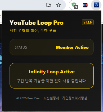 오늘 소개할 YouTube Loop Pro는 그 아쉬움을 '프리미엄'하게 해결해주는 브라우저 확장 프로그램입니다. Bear Dev.의 시그니처 감성을 담아 제작된 이 앱의 매력을 미리 공개합니다! 💎✨